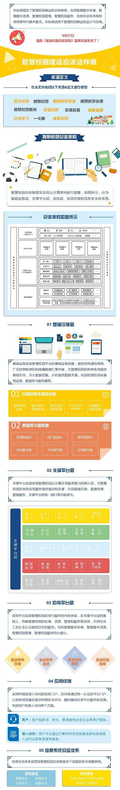 2018年6月27日,国家市场监督管理总局国家标准委最新公布了国家标准文件《智慧校园总体架构》GBT36342-2018,对于智慧校园的总体架构及建设进行了明确规范。