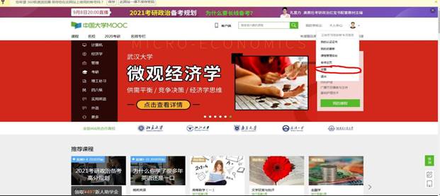 完善个人信息,把鼠标放在右上角小头像处,点击设置,进行资料修改,填写完整后点击保存,然后把昵称、真实姓名、身份证号码、课程名称发给高校管理员处进行赋权(各教学单位汇总后于18日前报送给信息中心冯老师)。