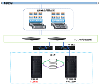 阶段二:因考虑到原有设备的整体更新淘汰周期,新增SC5020替换原有VNX5200双活容灾存储,并且扩展本地SC5020双活机制,利用存储自身提供的双活功能满足系统高可用性(RTO、RPO=0),降低风险点,提高服务响应,高可用管理自动化。