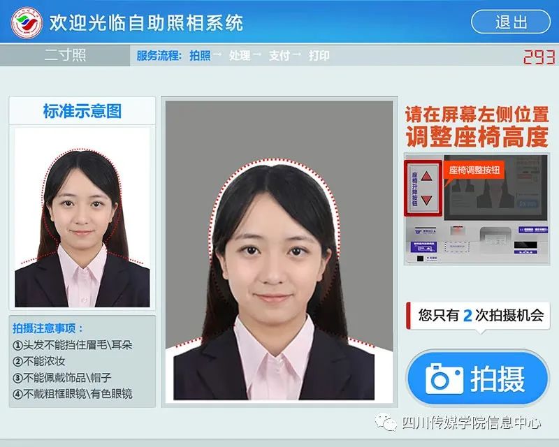 5、选择屏幕左侧上下按钮调节座椅高度,使头像在虚线框内,点击拍摄。