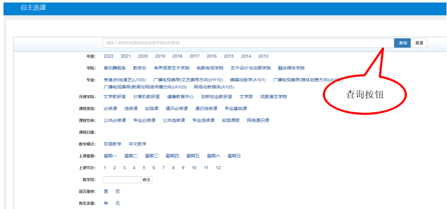 进入“自主选课”界面后,直接点击“查询”按钮即可查看公选课信息。