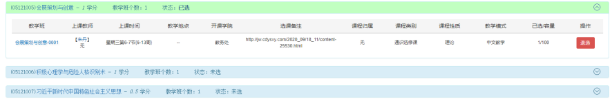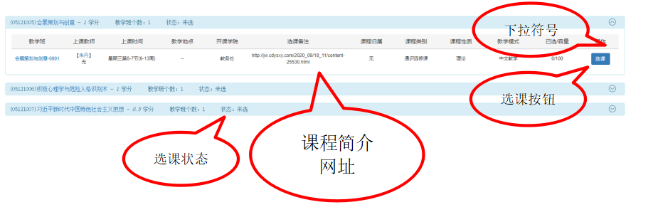 点击课程信息右侧“下拉符号”可查看上课教师、上课时间等,学生根据个人课表空余时间进行选课,点击右侧“选课”按钮,选课状态变为“已选”即为选课成功。